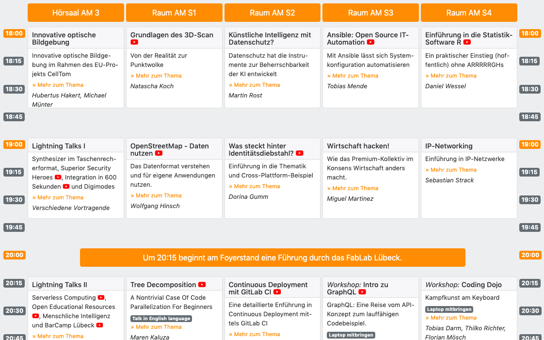Neben Vorträgen und Workshops finden sich im Foyer des Audimax Stände von engagierten Vereinen oder Organisationen, so hatten in den Letzten Jahren z.B. das Fablab Lübeck, Xtinction Rebellion aber auch ein Forschungsgruppe zum Thema Kohärenztomographie einen Stand im Audimax. Die Stände bieten Gästen eine Gelegenheit Hands-on einen Einblick in ein Thema zu erhalten und mit Experten ins direkte Gespräch zu kommen.