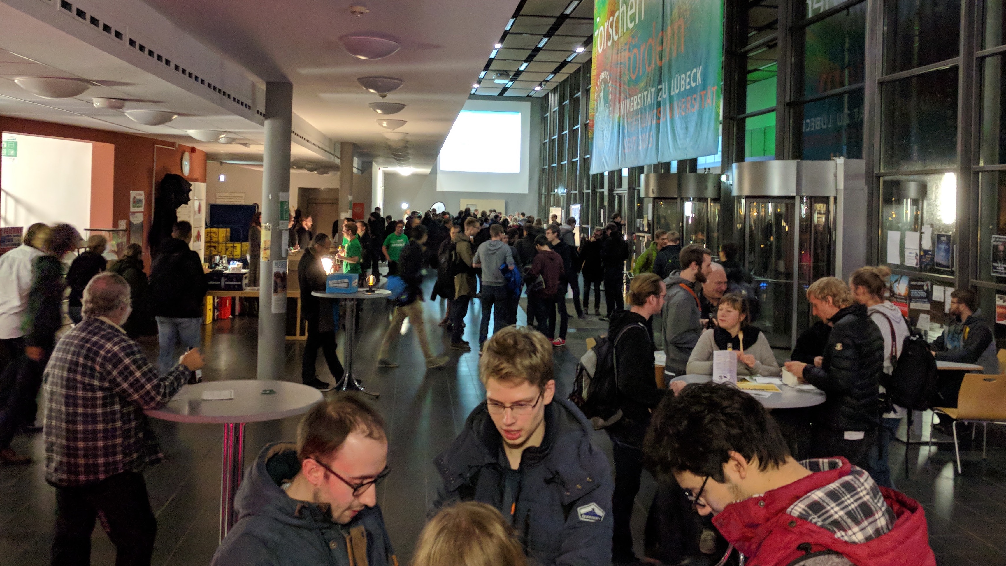 Neben dem Vortragsprogramm bieten die Nights of open Knowledge (NooK) Informationsstände im Foyer des Audimax der Uni Lübeck. Foto: Malte Schmitz, NooK Lübeck, 2017.